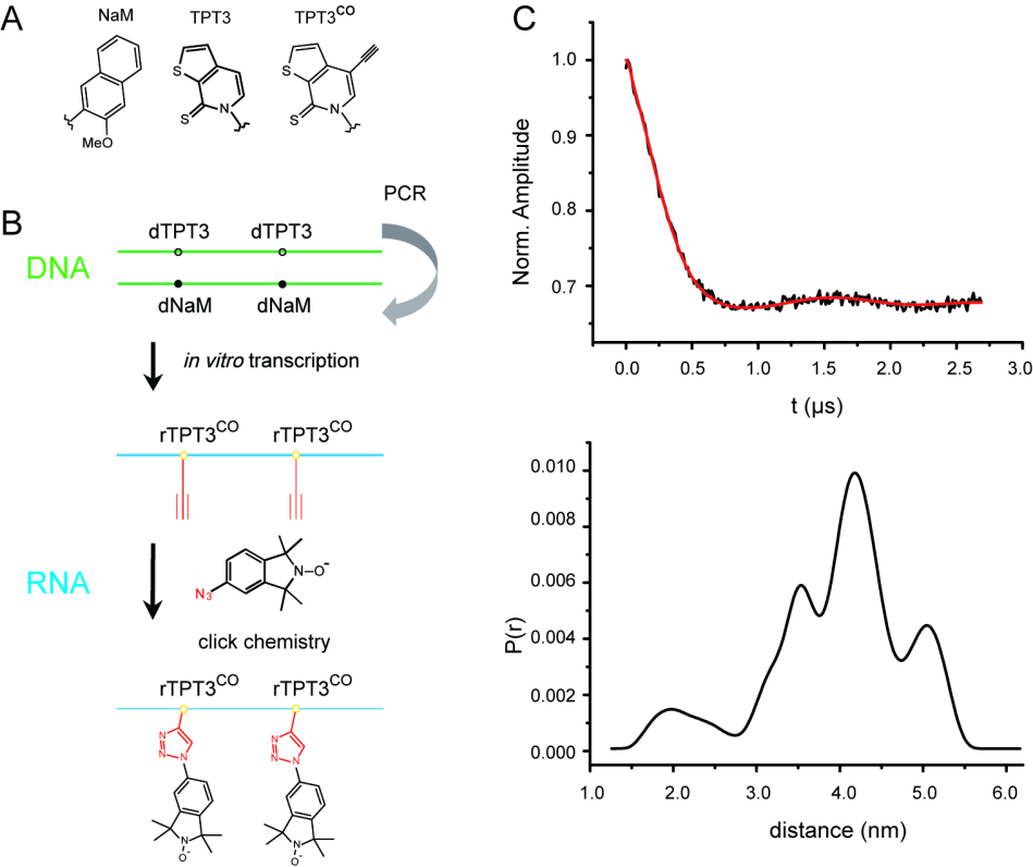 方显杨课题组利用包含NaM-TPT3非天然碱基对的系统,通过化学合成碱基带有炔基修饰的TPT3(rTPT3CO)(图1A),经过PCR和体外转录反应,在RNA中位点特异性的引入TPT3CO,进一步利用点击化学反应的高选择性,通过与叠氮基修饰的氮氧自由基化合物反应,建立了在非变性条件下长链RNA位点特异性自旋标记的策略,并成功应用于长度为419核苷酸的核糖核酸酶RNAse P的位点特异性自旋标记中(图1B)。通过与Peter Z. Qin教授课题组合作,应用连续波(CW)EPR 技术证实了该方法的高标记效率、 研究了标记位点附近的动态特性、以及用双电子自旋共振(DEER) EPR技术测定了成对自旋中心间的距离(图1C),实现了其在电子顺磁共振技术中的应用。