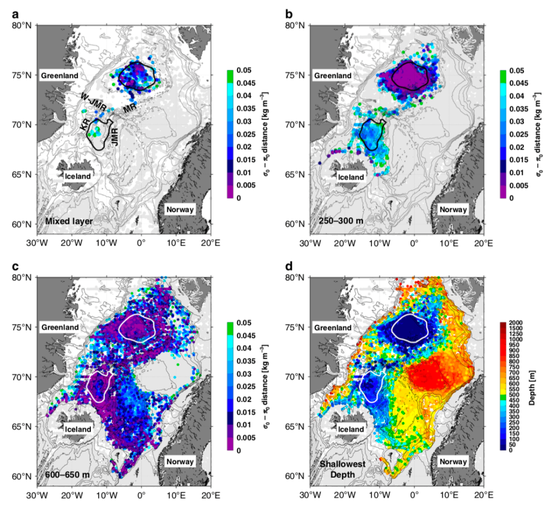 北欧海内高密度溢出流水体主要在冬季开阔大洋对流通风作用下形成。但受冬季海况影响,难以对该过程进行现场观测,水体形成后下沉,在海洋次表层流动,对其路径的研究具有很大难度。虽然前人在冰岛北部证实了沿冰岛陆坡分别向东西两侧流动的溢出流水体路径(如图1所示),但该水体的形成区域与上游路径仍不清楚。本研究通过计算海洋位势密度-位势涩度坐标系中不同水体间的距离(sigma-pi距离),追踪了冰岛陆坡处的高密度溢出流水体。从冬季混合层内水体与冰岛陆坡处高密度溢出流水体间sigma-pi距离极小值的分布图(如图2a所示)中可以发现,高密度溢出流水体主要形成于格陵兰海涡流区域,水体形成后沿Mohn脊和冰岛海东西两侧流向冰岛北部的路径分别在250-300米与600-650米水层sigma-pi距离极小值的分布图(如图2b-c所示)中体现,并进一步在绝对地转流流速场中得到验证。