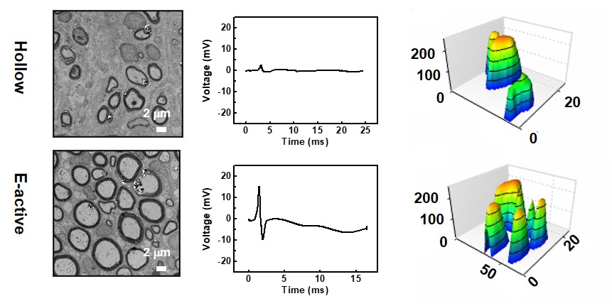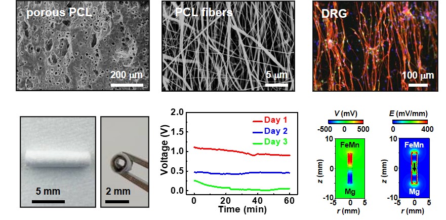 该自供电神经修复导管由可降解原电池与人工导管复合而成,可提供结构及电场双重诱导作用。神经导管最外层为多孔PCL,提供力学支撑,第二层为与神经组织力学性能相匹配的柔性PLLA-PTMC材料,最内层为电纺PCL纤维薄膜。该电活性导管可在大鼠体内提供大约3天的持续电场,促进外周神经的再生。