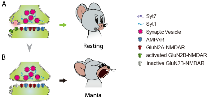 图一. Syt7缺陷导致双相躁狂的发生机理