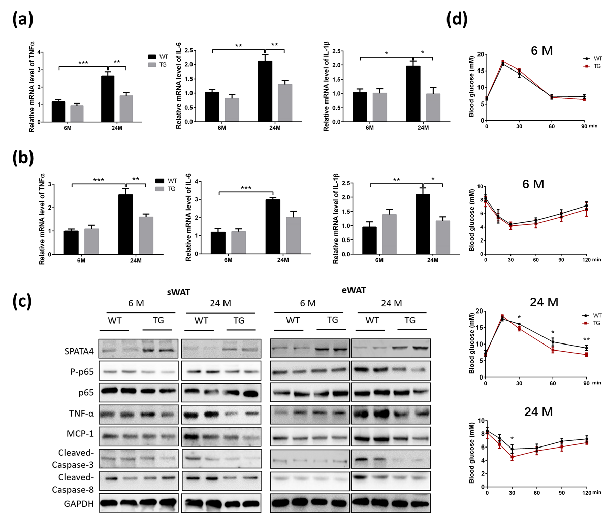 机体在衰老过程中会伴随着慢性炎症的积累,炎症也会进一步加剧衰老与衰老相关疾病进程。以往研究结果报道,白色脂肪是在衰老个体中最早发生炎症累积的组织,进而促使机体产生胰岛素抵抗。研究者发现,SPATA4过表达的老年小鼠白色脂肪组织中(包括皮下脂肪和内脏器官周围脂肪)炎症因子、细胞凋亡maker、衰老相关分泌表型SASP的表达量均显著低于野生老年小鼠。糖耐量和胰岛素耐受实验结果显示SPATA4过表达能提高老年小鼠的胰岛素敏感性,维持机体代谢稳态。另外,研究者还构建了SPATA4过表达的雄性小鼠和雌性小鼠,实验结果显示,SPATA4过表达对于老年雌性小鼠也具有维持脂肪细胞分化功能、改善衰老相关脂肪异位分布、降低脂肪组织炎症和凋亡反应、保护机体代谢稳态等功能,表明SPATA4改善机体衰老相关代谢功能障碍并未有性别差异。