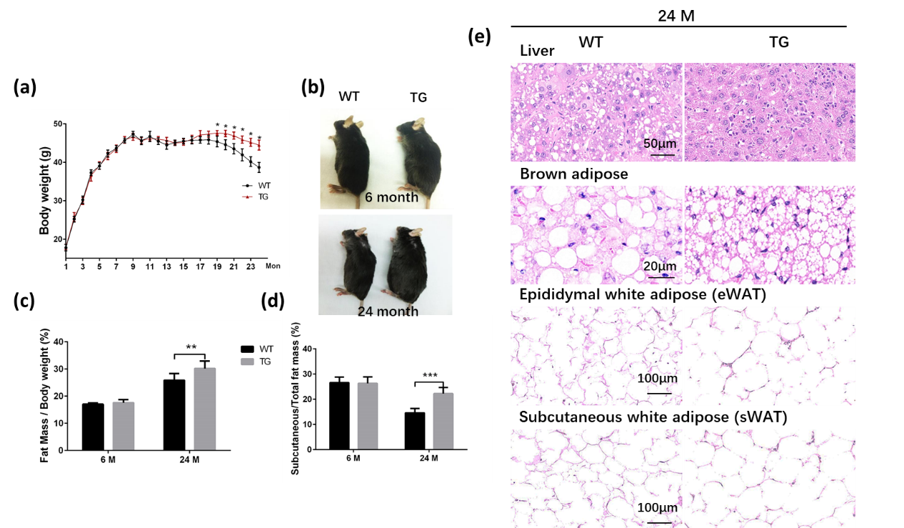 SPATA4(又名TSARG2)是本课题组自主克隆出的生精相关基因,在多个物种中保守表达,前期研究结果提示SPATA4对于细胞分化具有重要的调节作用。因此研究者构建了SPATA4过表达小鼠模型探究该基因对于机体代谢、细胞分化等生理功能的影响。SPATA4过表达小鼠和野生小鼠在年轻阶段体重上无明显差异,然而在年老阶段,野生小鼠体重呈显著下降,SPATA4过表达小鼠却可以维持正常体重。解剖后发现,相较于老年野生小鼠。SPATA4过表达小鼠有更多的皮下脂肪(subcutaneous fat,简写为sWAT)分布,相反地,由于衰老过程中肝脏以及褐色脂肪中脂滴过度积累的情况则显著改善。同时,SPATA4过表达还能够维持脂肪组织细胞正常形态,这对于维持脂肪细胞正常功能具有重要的作用。