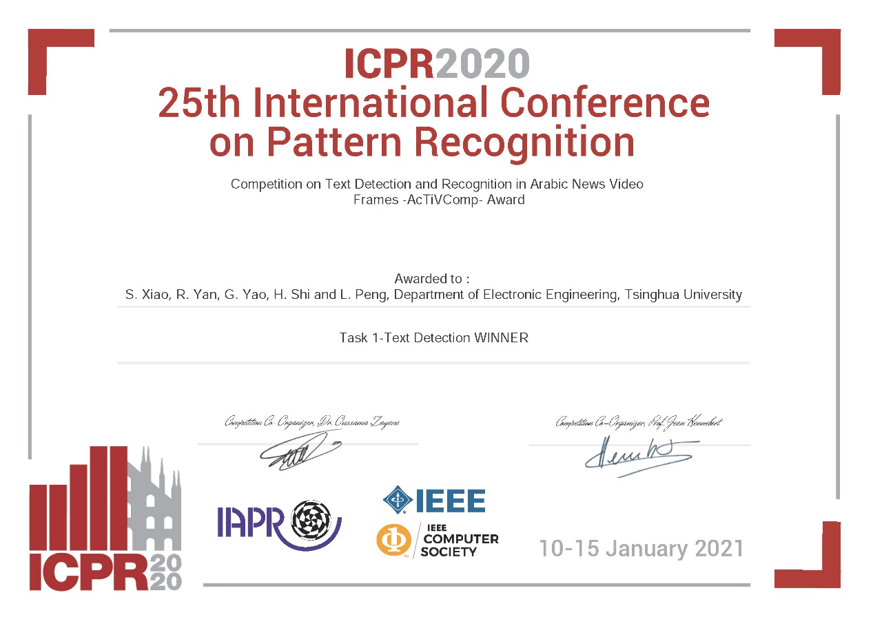 乐鱼(中国)网2月5日电 在近日线上举行的第25届模式识别国际会议(International Conference on Pattern Recognition,ICPR)上,第三届阿拉伯文视频文本检测与识别竞赛结果揭晓。乐鱼在线平台电子工程系媒体大数据认知计算研究中心彭良瑞副教授指导的2017级博士生闫睿劼、2019级硕士生肖善誉等提交的算法在文本检测和文本识别两项任务中均获得第一名。
