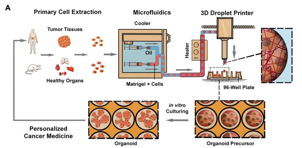 针对这些问题,本研究团队以微流控联动3D打印技术快速制造、培养和自动化操控建立正常组织和肿瘤类器官,全过程均一可控,可高通量规模化。通过微流控液滴技术将含有细胞的Matrigel剪切成直径约500微米的均一化微球并将其作为细胞活动的结构模板,经过1周培养熟化(细胞自组织)即可形成类器官。利用这个平台成功培养了小鼠肝、肺、肾等正常组织的类器官,癌症病人肺、肾、胃、直肠等多种肿瘤的类器官。