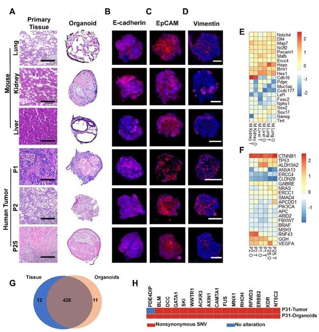 本研究实验分析表明,所制备的正常和肿瘤类器官,类器官个体之间形态和尺度均一;组织病理学特性与其源组织/肿瘤一致;细胞学生物标志物蛋白质的表达与其源组织/肿瘤一致。RNA测序表明类器官与其源组织/肿瘤的基因表达谱高度一致;全基因外显子测序显示肿瘤类器官与其源肿瘤保持了97%的单核苷酸变异的重叠,以及>93%相同的原癌基因突变;这些类器官能很好地反映其源组织/肿瘤的遗传背景、基因型和表达谱。