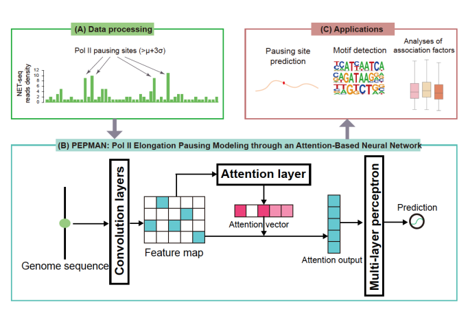 真核生物的转录是一个高度复杂且被准确调控的动态过程,RNA聚合酶II(RNA polymerase II, Pol II)作为转录过程(特别是转录延伸阶段)的核心分子成员,对遗传信息的传递起着关键作用。研究表明,在转录延伸过程中,普遍存在Pol II暂停(Pol II pausing)现象,其参与下游基因的表达调控、影响基因可变剪切的发生,与细胞分化、发育等生命活动息息相关。目前,Pol II暂停相关的转录调控机制研究主要依赖于NET-seq(Native elongating transcript sequencing)等高通量测序技术,成本高、需要一定实验周期。因此,如何实现在全基因组水平上快速、高效的分析Pol II暂停的偏好位点及其序列特征,以及其与相关转录因子间的关系,是转录调控领域亟待解决的技术难点。为了解决这一问题,来自乐鱼在线平台的曾坚阳、赵诞团队采用基于注意力机制(attention mechanism)的卷积神经网络对全基因组上的Pol II暂停位点进行预测。在NET-seq数据集上,其预测准确率均显著优于现有机器学习模型。此外,研究组通过分析模型的注意力机制以及分析模型在基因组上特定位点的预测值,进一步探索了Pol II暂停的生物学特征以及和其他转录调控机制的关系,包括:发现了决定Pol II暂停的序列特征以及其与暂停位点的关系;通过分析不同可变剪切方式位点上Pol II的暂停倾向,提供了Pol II影响可变剪切的可能生物学机制;全面分析了Pol II与转录因子、组蛋白修饰、DNA甲基化发生的相关性;发现模型能够很好的弥补测序数据深度不足带来的缺陷。