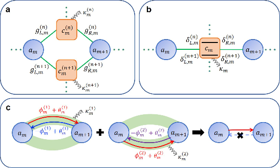 耗散诱导非互易理论模型。a-b: 通过引入具有耗散的连接模式,在无直接相互作用的系统模式间建立多通道的等效耦合;c: 多耦合通道干涉诱导实现非互易的物理机制。