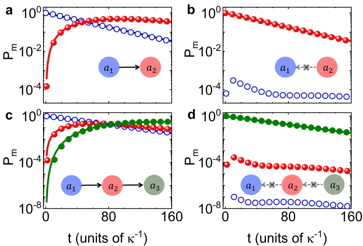 单向能量传输结果。通过调节相干耦合和耗散相位,在满足单向耦合条件时,可实现两模式(a-b)和三模式(c-d)的单向能量传输。