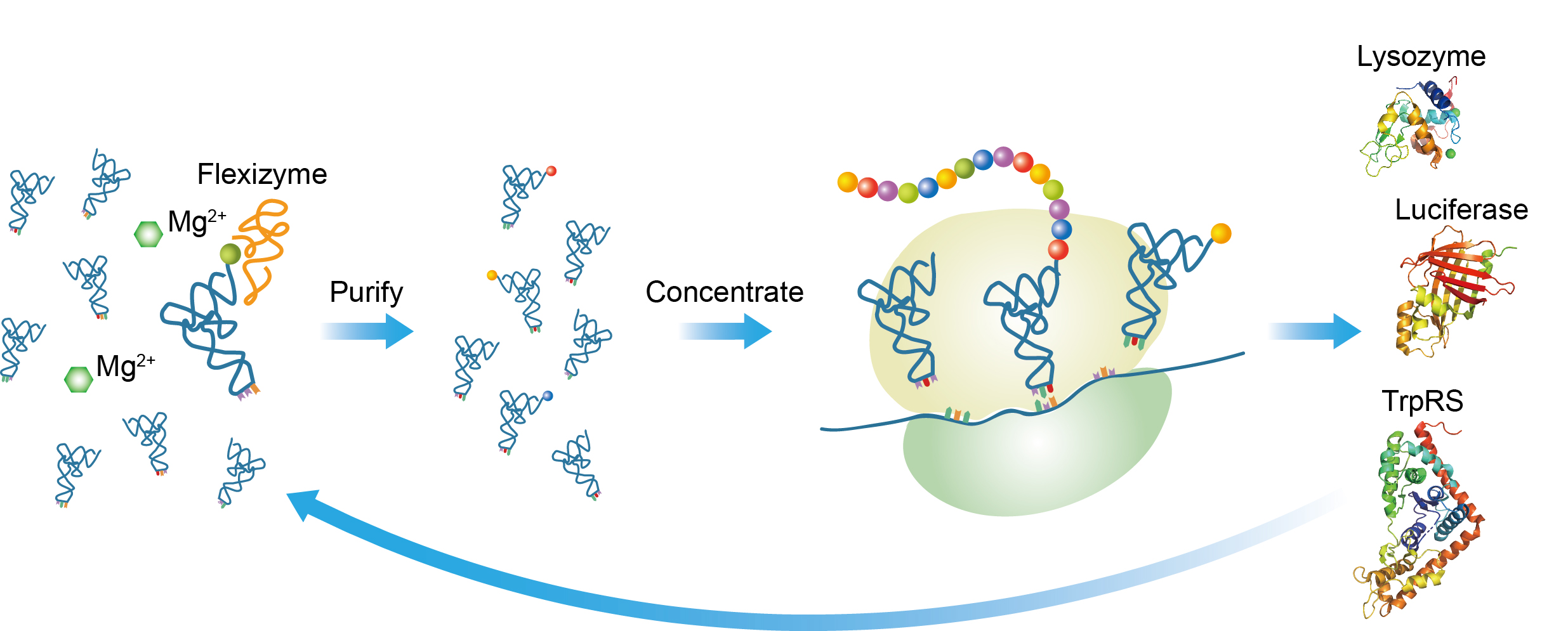 在该研究中,乐鱼在线平台生命学院朱听课题组在天然手性模型中对使用Flexizyme进行tRNA氨基酸装载的蛋白质翻译系统做了重新设计与优化,首次实现了不依赖氨酰tRNA合成酶的蛋白质翻译并得到多种具有活性的酶(图1)。值得一提的是,在没有氨酰tRNA合成酶的参与下,该系统翻译产生了具有活性的氨酰tRNA合成酶TrpRS,显示在生命起源过程中,类似具有tRNA氨基酸装载功能的核酶可能在蛋白质翻译系统的早期进化中发挥了重要作用。