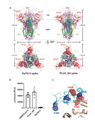 图1 a. RaTG13和PCoV_GX刺突蛋白三维结构;