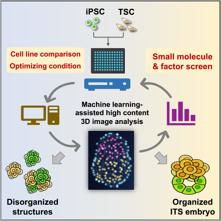 本研究中,作者将高内涵共聚焦成像筛选与类胚胎模型相结合,并利用机器学习辅助的分析策略对类胚胎图集进行了高效客观的分析,建立了全自动智能化的类胚胎分析策略。应用此策略,研究人员揭示了不同多能干细胞株生成类胚胎的能力具有很大的异质性,并对可促进类胚胎发生的生长因子及小分子进行了筛选,确定了骨形成蛋白4(BMP4)在类胚胎生成过程中的促进作用。本研究为解决现有类胚胎模型面对的难题提供了创新方法。