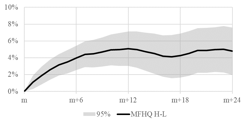 本研究尝试了在基金经理层面对管理能力和持仓加权,其中经理的收益率是月末在管资产的管理规模加权收益率;持仓则是在管资产持仓的加总。实证结果表明,基于基金经理层面进行管理能力度量加权也具有类似的效果,MFHQ高减低套利组合超额收益率可以达到年化23.1%(图3)。此外,本研究还发现,MFHQ指标预测的未来收益具有长期持续性,且MFHQ指标预测了公司未来基本面信息的变化,进一步说明本指标揭示了公司的基本价值,提升了市场质量。
