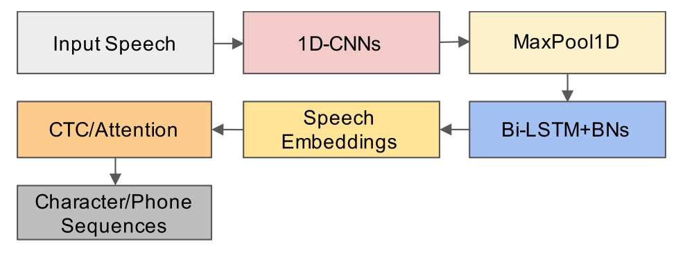 图2:语音特征提取过程以及使用联结时序分类或基于注意力的解码器从语音特征中预测字符或音素序列