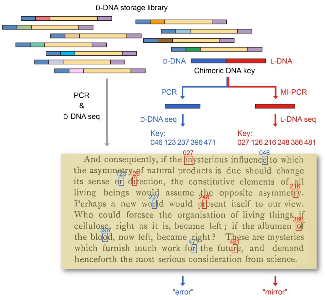 此外,研究者还进一步开发了基于镜像DNA的信息隐写技术:将加密信息的密钥写入镜像DNA并混入天然DNA文库,使用天然DNA扩增与测序技术仅能读取天然DNA中的错误密钥,导致解码错误信息;只有使用镜像DNA扩增与测序技术才能读取镜像DNA中的正确密钥并解码加密信息(图4)。基于镜像DNA的信息隐写技术可以有效提高DNA所携带信息的保密性,为镜像生物学系统在信息安全领域的应用提供了新的思路。