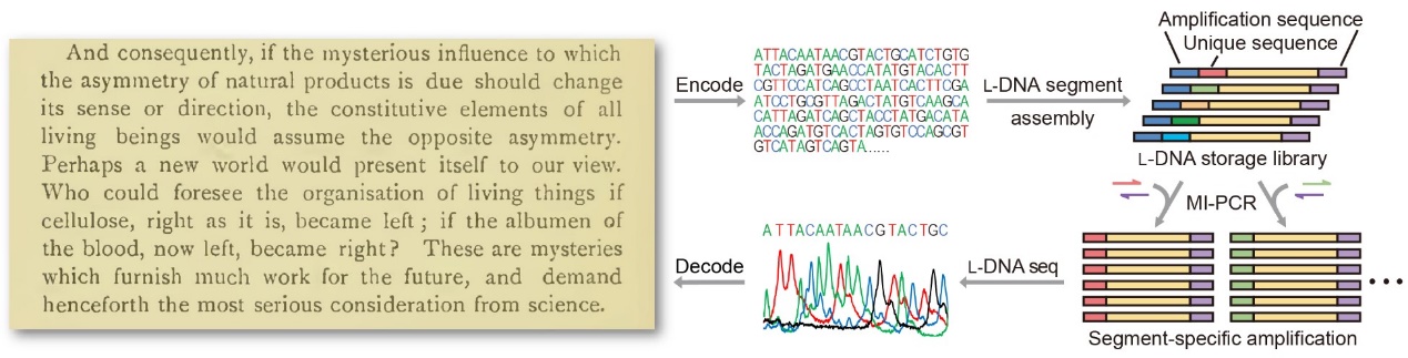 同时,研究者还开发了基于镜像硫代磷酸DNA的镜像DNA边合成边测序技术。相比于该课题组此前开发的镜像DNA化学测序,新技术在测序读长、准确性、可操作性等方面都具有明显优势。上述高效、高保真的镜像DNA序列组装与扩增系统,结合简便实用的镜像DNA测序技术,为实现镜像DNA信息存储创造了条件。研究者将巴斯德于1860年首次提出“镜像生物学世界”这一概念的文字转换为碱基序列写入镜像DNA文库中,并从镜像DNA中准确读取了该文本信息,从而实现了镜像DNA信息存储(图2)。巴斯德的经典文献也成为了首段被存入镜像DNA的信息。
