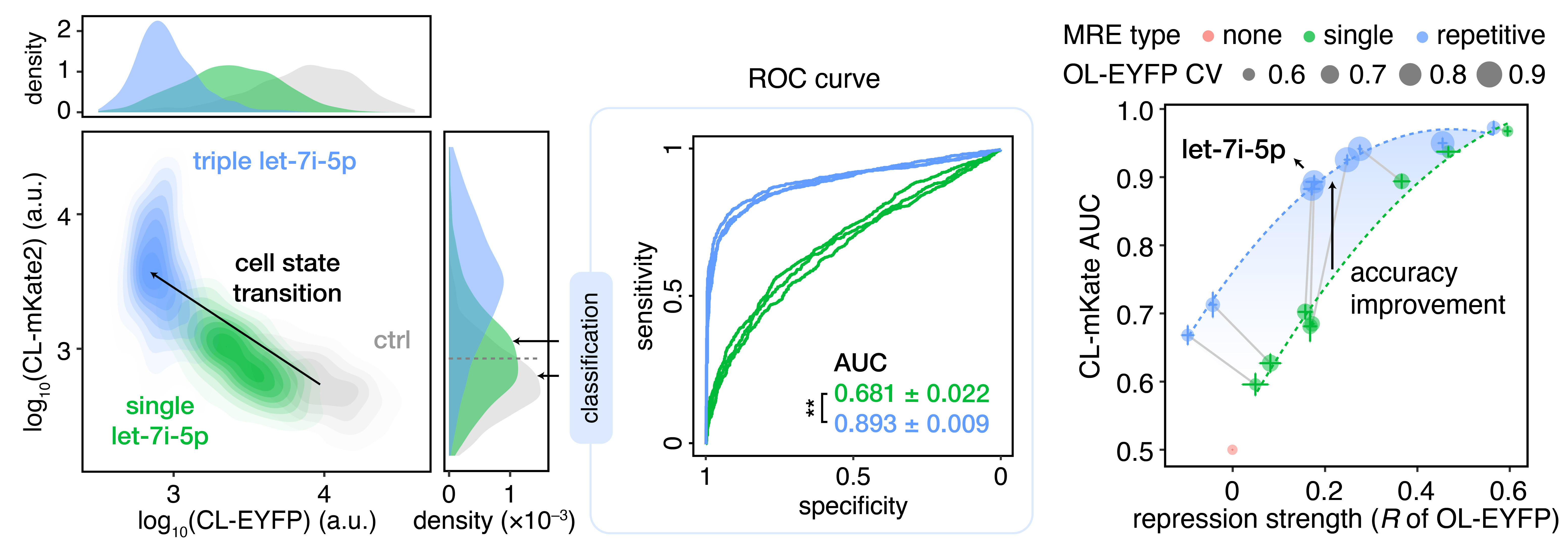 在前期研究中,汪小我课题组提出了“数基–碳基融合”的研究思路,建立了竞争性调控的一致化数学模型,结合数学模型和合成生物学实验共同揭示了内源性竞争性RNA对microRNA调控能力的定量影响。在此基础上,研究团队基于一致化竞争性调控模型,预测在基因表达水平类似时,相互作用强度较弱的竞争性RNA可以起到缓冲基因表达噪声的作用。为验证这一猜想,研究团队设计了能够反映基因表达噪声水平的合成基因回路并将其导入细胞,定量观测拥有不同结合强度竞争性RNA的microRNA的基因表达调控噪声模式,证明了上述模型预测结果的准确性。此外,研究团队还利用类似思路发现,不同microRNA靶点的数量和组合形式也会对基因表达噪声造成明显影响。研究团队进一步将上述机制应用于一个以microRNA为系统输入的细胞分类合成基因回路的设计优化之中,通过改变microRNA的种类及其靶点形式定向调控细胞分类器中基因的表达噪声,成功提升分类器的分类效果,实现了对肿瘤细胞系(HeLa)的精准识别。