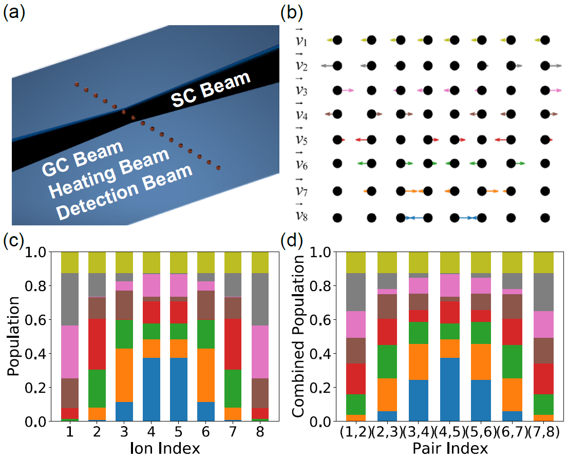 离子阱体系是目前实现量子计算、量子模拟的主要技术路线之一。当前离子阱体系的一个重要的误差来源,是离子受到环境电磁噪声影响或与真空腔中残余的气体分子碰撞而被加热。为了提高量子计算的线路深度以及量子模拟所能研究的时间尺度,离子需要在实验过程中保持低温、稳定的状态。但是直接对全体离子进行激光冷却,将会破坏其内部能级编码的量子比特信息。因此,实验中需要采用协同冷却的方法,通过激光的频率或空间位置来选择性地冷却部分离子,并通过这些“冷却离子”来使其它编码量子比特的“数据离子”维持低温。