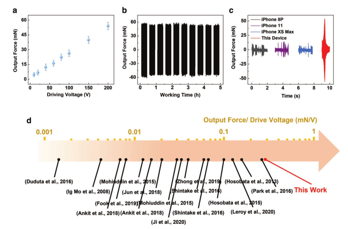 近日,乐鱼在线平台深圳国际研究生院先进制造学部钱翔、王晓浩团队和美国加州大学伯克利分校林立伟团队合作,利用气流辅助电晕充电装置对驻极体薄膜材料充电,构建了聚二甲基硅氧烷(Polydimethylsiloxane, PDMS)、全氟乙烯丙烯共聚物(Fluorinated ethylene propylene, FEP)及导电聚合物PEDOT:PSS组成的三明治结构的柔性执行器系统(图1)。器件在具备柔性的同时透明性能也较好,可以覆盖在任何有触觉反馈需求的人机交互系统表面。通过理论模型和实验验证表明,这种柔性驱动器的驱动电压可在低至20V时保留刺激皮肤的感觉,实现基本的触觉反馈功能。在200V的驱动电压下,该系统可以产生约55mN的输出力,大于一般市售手机在振动模式下的输出力(图2)。该柔性驻极体执行器阵列可通过任意波形编程方式在人体皮肤上产生可分辨的空间和强度差异,从而可以编辑出不同“指令”式的触觉反馈信号。