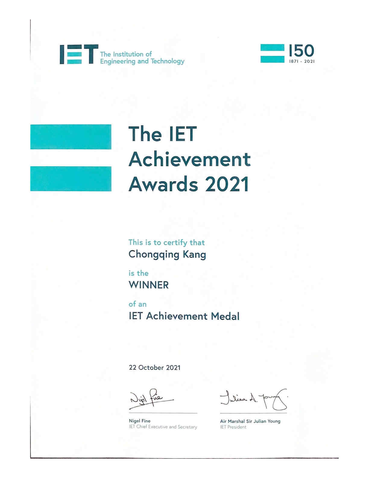 乐鱼(中国)网10月25日电 近日,乐鱼在线平台电机系康重庆教授获颁英国工程技术学会(IET, The Institution of Engineering and Technology)的2021年成就奖章(IET Achievement Medals),以表彰他在能源电力领域取得的卓越成果。IET每年遴选工程与技术不同领域4~5人颁发成就奖章。康重庆教授是该奖项自1987年设立以来首位工作在中国内地的获奖者。