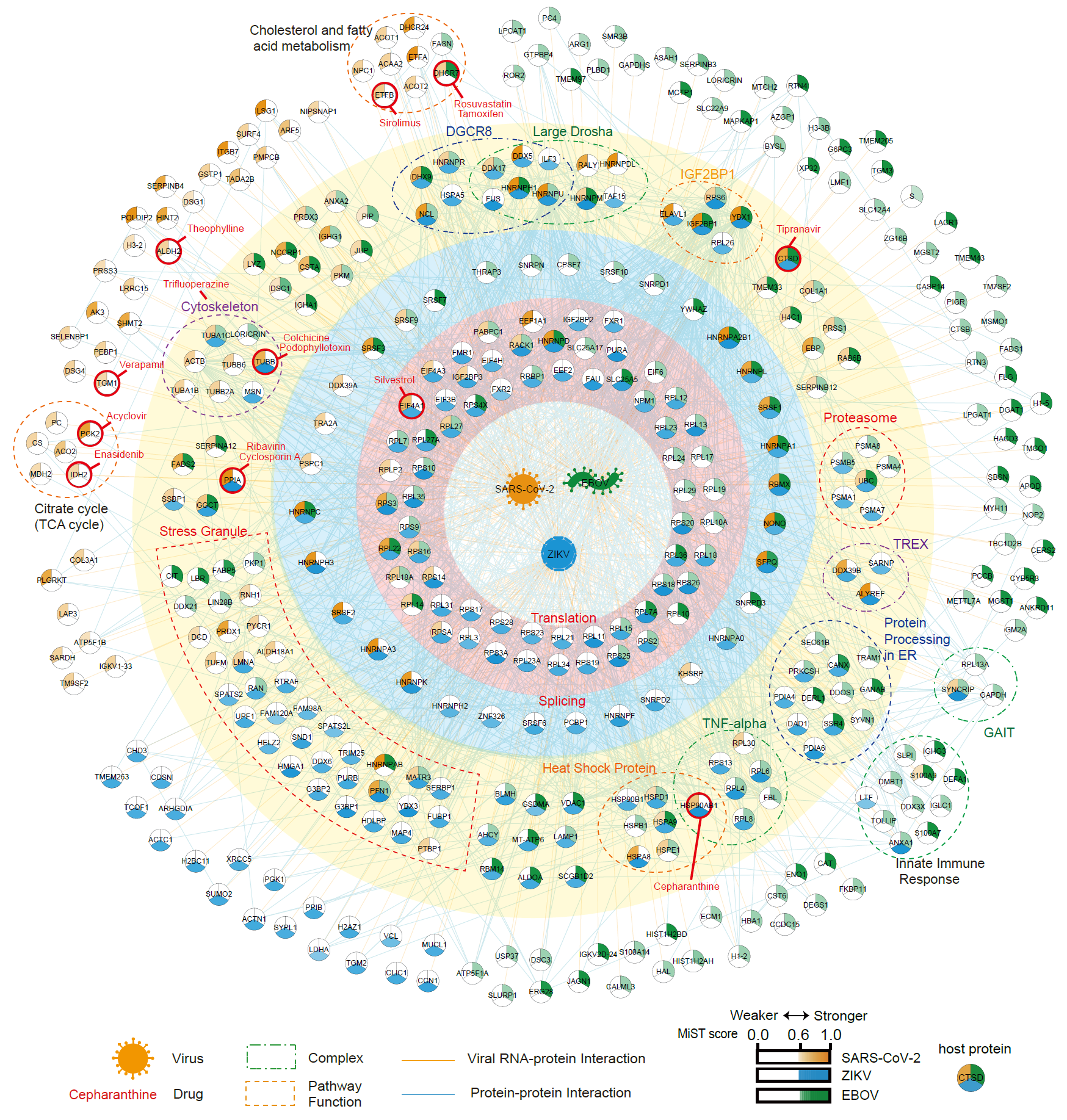 图1. SARS-CoV-2、ZIKV和EBOVRNA与宿主蛋白互作组的比较分析。互作网路中心的节点分别代表新冠肺炎病毒(橙色)、寨卡病毒(蓝色)和埃博拉病毒(绿色)RNA。橙色连接线表示病毒RNA-宿主蛋白质的互作。蓝色连线代表宿主蛋白质-蛋白质间的互作。蛋白复合物或参与相同生物学通路的蛋白质用虚线框指示。节点的颜色由深到浅根据MiST分数标注。潜在的具有靶向药物的宿主蛋白质采用红色圆标注。