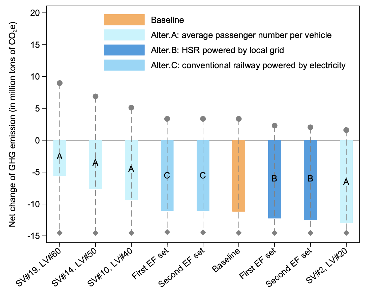基准假设和其他假设下的温室气体排放变化(来源:Lin et al.)