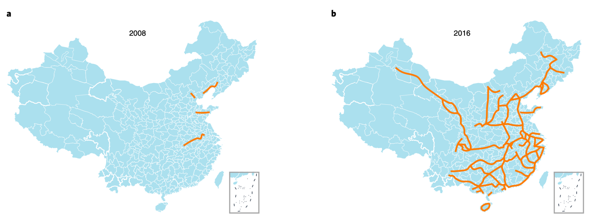 2008-2016中国高铁网络发展情况(来源:Lin et al.)