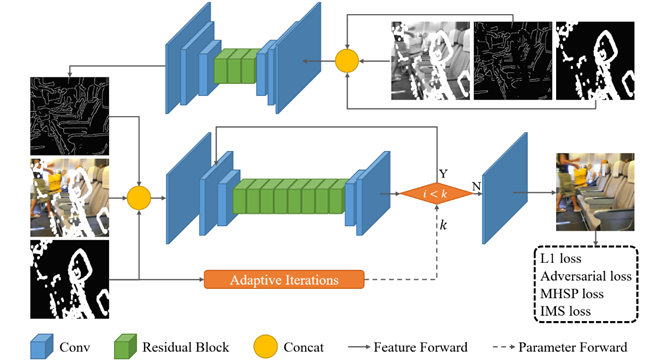 2017级控制科学与工程专业博士生陈胜杰(指导教师:李秀教授)与阿里巴巴高级算法专家郭振华博士联合发表论文《一种探索更多信息的自适应迭代图像修复方法》(An Adaptive Iterative Inpainting Method with More Information Exploration)。该论文主要提出了一种可以学习多隐空间语义信息的自适应迭代图像修复方法。采用根据输入图像缺失面积自适应调整迭代推理次数的策略,保证修复效果的同时降低计算量。提出多离散隐空间感知损失和高饱和度域损失,提升模型的语义学习能力。