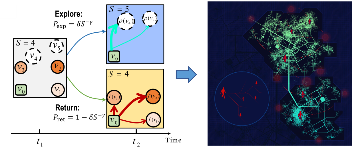 (左)综合建模移动记忆机制和社会交互机制的协同移动模型。(右)基于协同移动模型的多智能体城市演化框架。