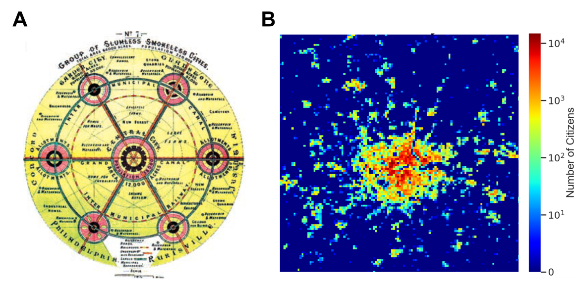 城市是人类和资源在时空上的聚集,其为大规模社会协作和基础设施的复用提供了便利条件,能显著地提升社会经济效益,因此城市化在近代以来成为了席卷全球的大潮流。早在1898年英国城市规划学者埃比尼泽·霍华德(Ebenezer Howard, 1850-1928)提出了花园城市(Garden City)模型,其将理想城市构想为对称的同心圆结构,以期最大化土地和基础设施的使用效率,并有效抑制贫民窟、城市蔓延等问题。然而,随着近几十年来大规模城市数据的广泛采集,大量实证研究显示城市演化过程中存在显著的分形(Fractal)现象,表明城市演化是一个由自底向上驱动的复杂系统,与自顶而下规划的完美几何布局存在显著差异。迈克尔·巴蒂(Michael Batty)等研究者提出城市演化规律应由普遍存在于城市数据中的统计规律加以刻画,其中已广泛验证的有:城市面积分布的齐夫定律(Zipf's Law),城市面积与城市人口间的超线性关系,以及城市人口的负指数空间分布。