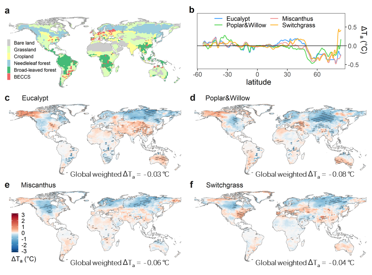 为此,李伟课题组联合国内外多所研究机构,针对全球大规模生物能源作物种植情景的生物物理效应展开研究。研究团队利用动态全球植被模型生物能源作物版本,与大气模式进行耦合,探究了未来不同种植情景下,四种生物能源作物通过生物物理过程对气温的影响(图1)。该模型版本包括了课题组自主开发的详细生物能源作物生理生态和管理过程。研究发现,大规模生物能源作物种植能够通过生物物理过程降低全球陆地平均气温0.03—0.08°C,但不同地区的生物物理效应空间异质性非常大。木质能源作物种植区由于蒸腾作用更强、气动阻抗更小,因此降温效应更为明显。该研究评估了大规模生物能源作物种植的生物物理效应,对未来气候变化减缓政策的制定以及生物能源种植的合理规划具有重要的启示意义。