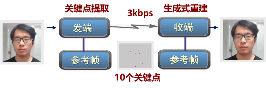 电子系陶晓明项目组研发了一种低码率无线视频语义通信系统,以人脸视频为例,利用参考帧作为先验知识,在发端提取面部关键点,传输十个关键点特征,在接收端进行生成式重建。实测结果表明,该系统可在3kbps的低码率情况下,实现高质量人脸视频传输。本技术发明应用于中国移动“新一代平安乡村视频安防监控系统”,大幅降低无线视频传输数据量;还应用于“蓝鲸二号”海上钻井平台远海作业区的卫星通信系统,以及航空、海防、交通等领域的无线专网视频通信设备中。