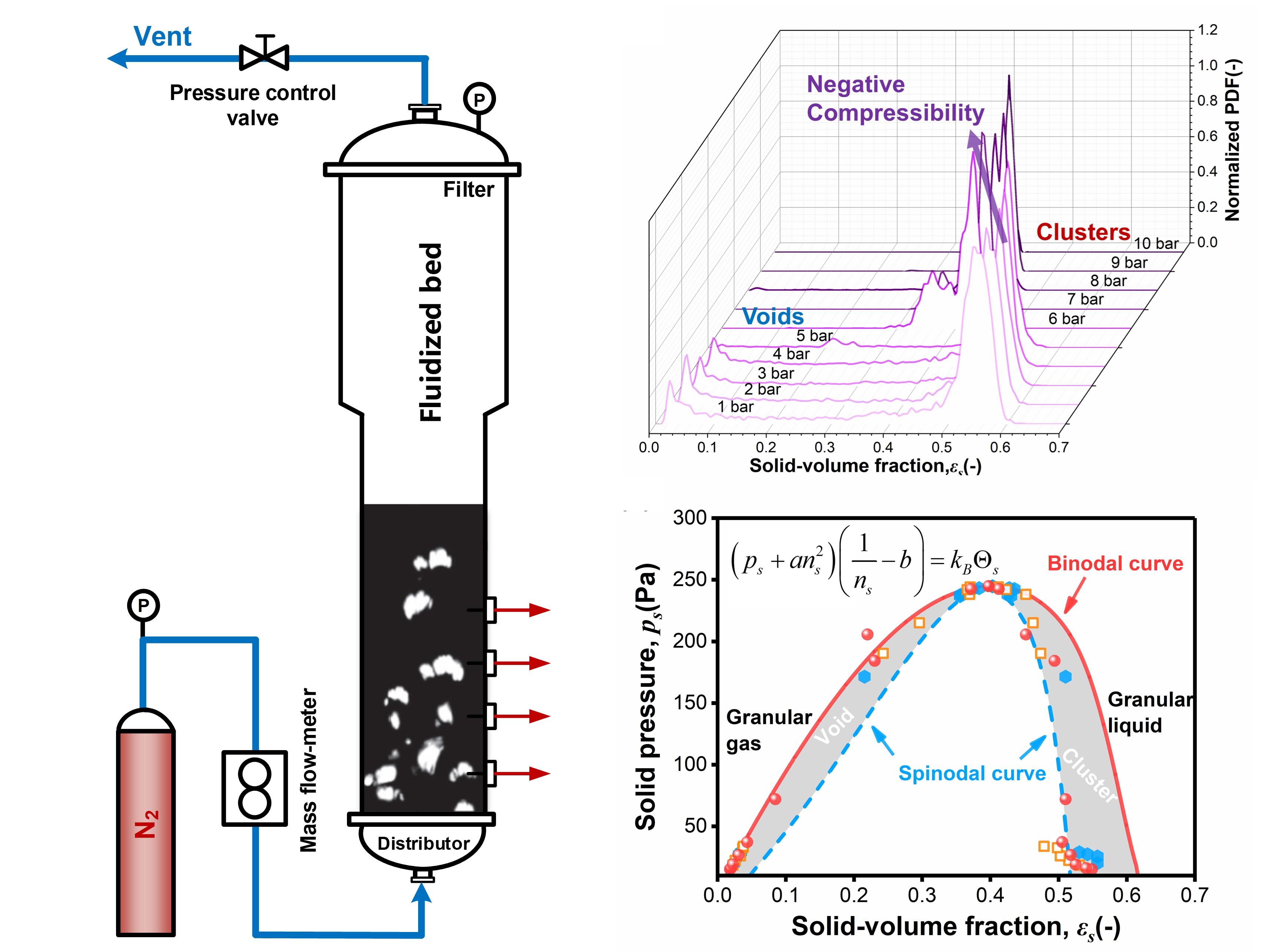 同时,魏飞团队还针对CO2高压加氢流化床反应器中气固流动复杂难控的工程问题,研究了气固相结构调控策略。引入描述相共存的vander Waals方程,利用统计物理学方法建立数理模型对高压下气固流态化系统进行稳定性分析,奠定流态化内气固相分离的理论基础,通过相图定量描述高压流态化稳定相共存的区间,实现对流态化中相结构转变的科学调控,指导了CO2高压流化床反应器的结构设计。相关成果“流态化中的相共存”(Phase coexistence in fluidization),以Letter形式发表于《美国化学工程会志》(AIChE Journal)期刊上,该栏目主要报道化工领域中具有前瞻性以及有潜在重大影响的工作。