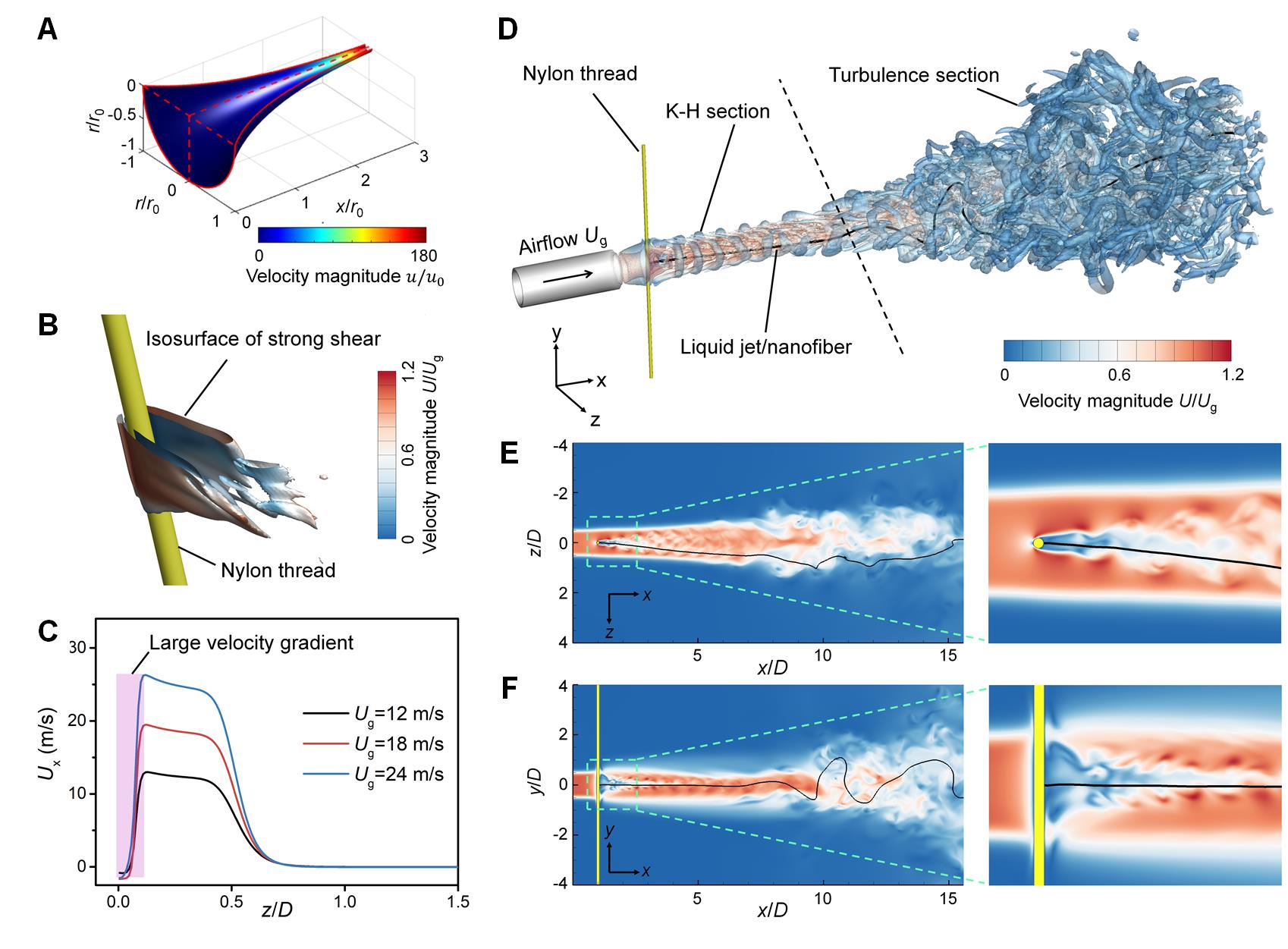 该方法采用全新设计的卷对卷系统来实现无针溶液传输以制造纳米纤维,纺丝溶液被连续运动的闭环尼龙线从储液槽中携带出后,在高速气流的驱动下,形成泰勒锥并高速喷射,通过快速拉伸和摆动形成纳米纤维。该技术精确设计了空气射流与卡门涡街相结合的气流结构。通过流体理论和计算流体动力学模拟的研究发现,穿过尼龙线的高速气流在尼龙线的背风侧产生强烈的剪切应力和卡门涡流。强剪切应力促进了泰勒锥的形成和溶液射流的细化,而卡门涡旋扰乱了流场并加速了气流从层流到湍流的转捩,促进了溶液射流的挥发。两者的共同作用,极大促进了纳米纤维的高通量生产。