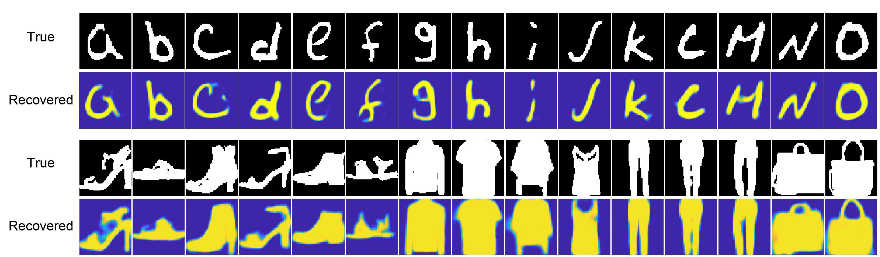 通过超快光电探测器可以获得脉冲串波形,经神经网络模型进行训练后,可以直接从不同的脉冲波形中恢复出被探测图像。图3展示了来自不同数据库中图案的成像效果。