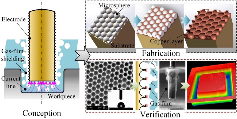 乐鱼在线平台机械工程系精密微纳制造工艺与装备研究团队在前期采用侧壁绝缘膜微细电解加工研究基础上,面向解决侧壁绝缘膜不可靠、易损耗的问题,提出了一种微细工具电极侧壁疏水表面形成的“无形”绝缘气膜提高微细电解加工定域性的方法。该方法探索出单层模板自组装工艺和微细电铸工艺,制备出微纳米尺度球形阵列内凹坑构建的新型侧壁疏水表面微细工具电极。微结构微细电解加工实验表明,这种方法能有效抑制微细电解加工中侧壁杂散腐蚀,提高了微细电解加工的定域性精度。此研究为解决一直困扰微细电解加工杂散腐蚀问题提供了新的解决思路和方案,在微细棒状金属表面构建疏水表面、微结构微细电解加工等领域具有重要的学术价值和应用前景。