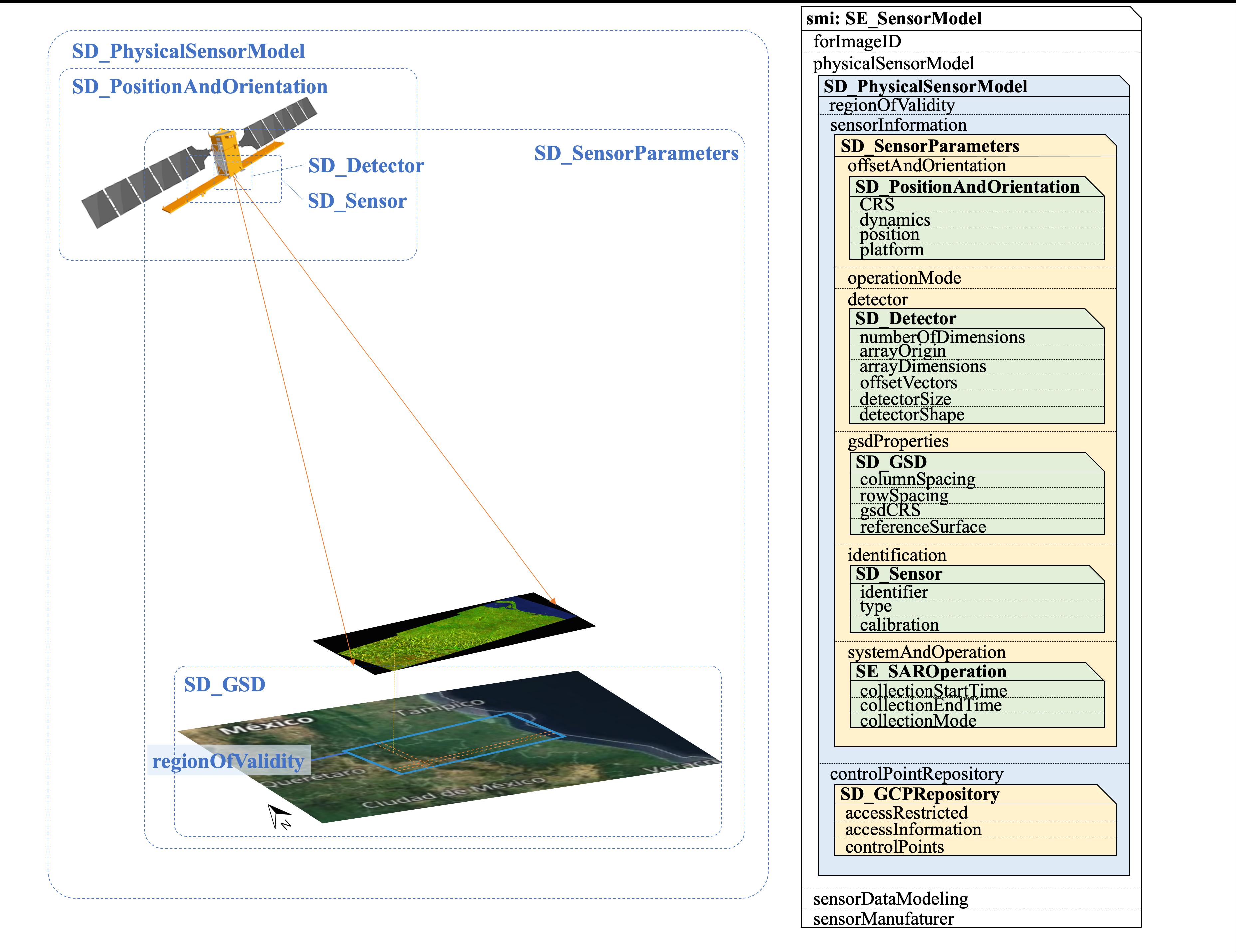 然而,目前ISO和开放地理空间信息联盟(OGC)各自提出的地理定位过程模型差异明显。ISO 19130-1和ISO 19130-2提出了地理定位模型的概念定义,但没有编码方案。另一方面,OGC从地理信息服务的角度提出了地球观测传感网等系列标准,但缺乏对具体的成像方式和过程本身的描述。研究组从抽象程度、对象定义、属性设置等多个方面分析对比了已有模型,提出了模型拆解和映射的方法,实现了语义和语法相融合的具体方案,定义了84个类和377个参数的详细编码方案,涵盖了光学、合成孔径雷达(SAR)、干涉合成孔径雷达(InSAR)、激光雷达(lidar)、声纳(sonar)等7大类被动观测和主动观测情形,适用于世界气象组织所统计的619种地球卫星观测传感器类型中的90%,也适用于大多数的航空传感器。