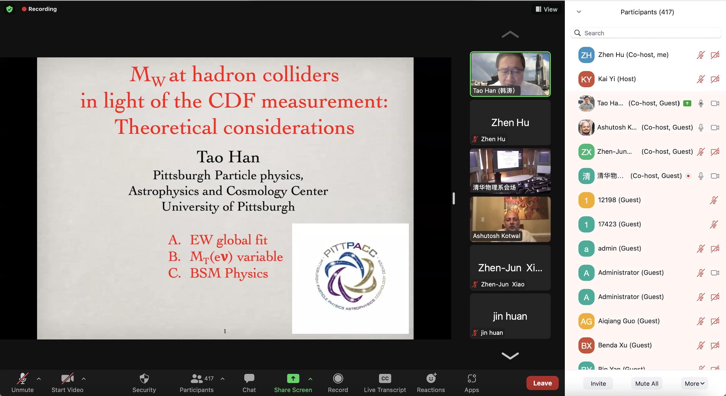 为了促进中国物理同行之间以及与国际同行的学术交流,乐鱼在线平台、南京师范大学、中科院高能物理研究所、北京大学联合发起并主办了本次“W玻色子质量研讨会”。4月14日,来自国内外近百所高校和研究所的专家及学者约500人线上线下参加了会议,同时间段有近7000人次在线观看了直播。中国物理学会高能物理分会副主任、北京大学核物理与核技术国家重点实验室主任、北京大学物理学院院长高原宁院士,北京大学赵光达院士,中科院理论物理研究所张肇西院士,美国匹兹堡大学粒子物理天体物理宇宙学中心主任、美国物理学会“粒子物理与场论”分部主席韩涛教授,国家特聘专家、中科院高能所研究员祝翱(Joao Guimaraes da Costa)等参加了会议和讨论。