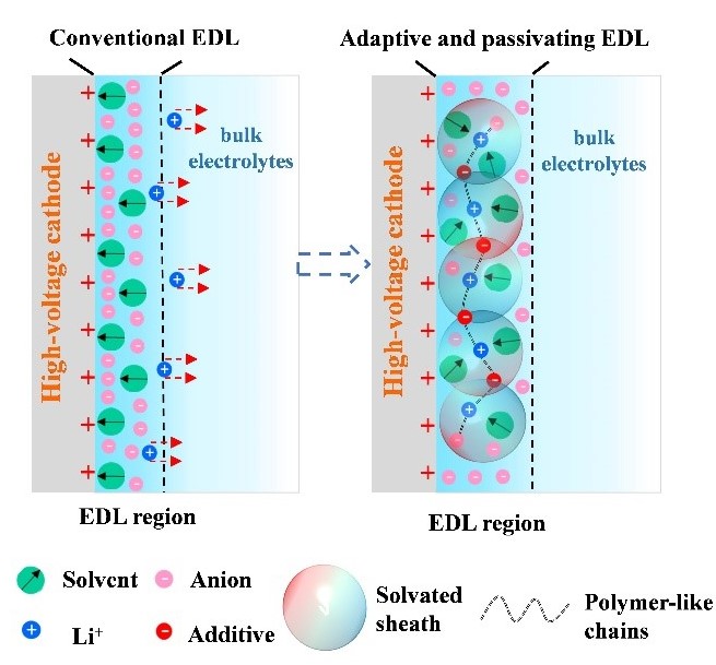 乐鱼(中国)网4月20日电 近日,化工系刘凯课题组通过对电解液的分子间作用力调控,突破了常规双电层结构的束缚,在低温快充锂金属电池方面取得重要进展。通过在电解液中加入新颖的“电压刺激响应添加剂”,在充电过程中,其可自发迁移到正极/电解液界面上,并选择性地与阳离子和游离溶剂结合,可以在双电层(EDL)内层形成独特的富含阳离子和支链状的超分子聚合物结构,构筑了一种独特新颖的“富锂离子-贫溶剂”双电层,其具有自适应和钝化特性,显著降低了醚基电解液在高电压正极表面的分解,由此,电池表现出优异的性能,例如超快速充放电和超低温应用,这在传统电解液设计中是很困难的。非常规的EDL结构打破了对经典EDL重排机制的固有认知,极大地提高了器件的电化学性能。