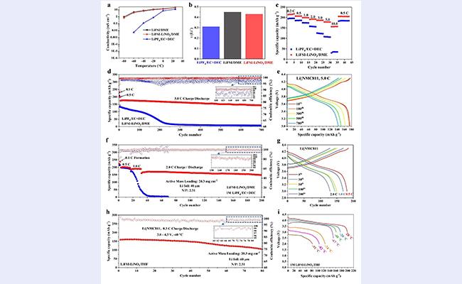 基于此新颖的双电层设计,耐低温电解液成功匹配了高压锂金属电池(高镍811正极/锂负极),并且表现出卓越的快充性能(5.0C充放循环700圈容量保持率高达90%)。该原型器件在-91℃下可获得86mAh/g的比容量,全电池在-40℃下快速充放电循环80圈容量保持率为68%(图2),超低温性能显著优于目前锂电池商用产品,为构筑低温及快充使用的高性能锂电池提供了新的方向。
