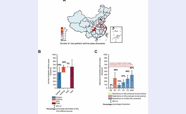 研究发现(图2),2019年我国城市地区有63.7万例儿童新发哮喘病例与NO2暴露有关,相应的经济损失达13.6亿元。在这些可归因于NO2的儿童新发哮喘病例中,与室内来源(燃气燃烧和香烟燃烧)和室外来源的NO2相关的病例数分别占74%和26%;限制室内和室外NO2排放对减少我国城市地区儿童新发哮喘病例数均有显著效果,并指出了限制排放的具体措施:限制室内NO2排放的有效措施之一是用电炉替代燃气炉进行烹饪,最多可减少29.6万例儿童新发哮喘病例;推广使用新能源汽车等相关措施可减少室外NO2排放,当室外NO2浓度达到WHO空气质量标准时最多可减少39.3万例儿童新发哮喘病例。
