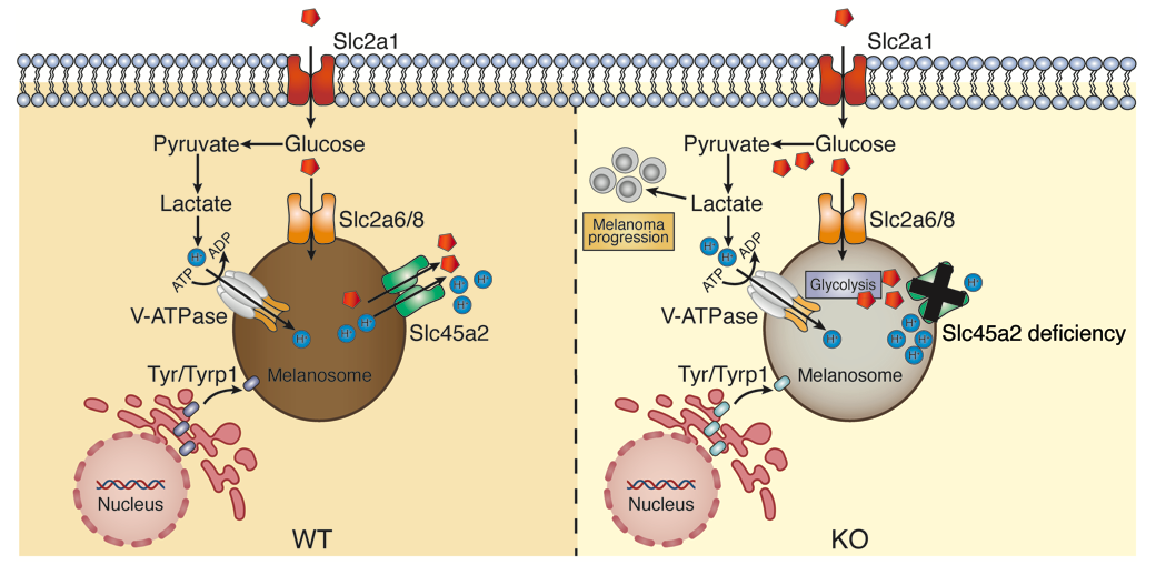 上述研究在《皮肤学研究》(Journal of Investigative Dermatology)在线发表,标题为《质子/糖类转运蛋白SLC45A2缺失增强黑色素体糖酵解代谢和促进黑色素瘤迁移》(Ablation of H+/glucose Exporter SLC45A2 EnhancesMelanosomalGlycolysis to Inhibit Melanin Biosynthesis and Promote Melanoma Metastasis)。
