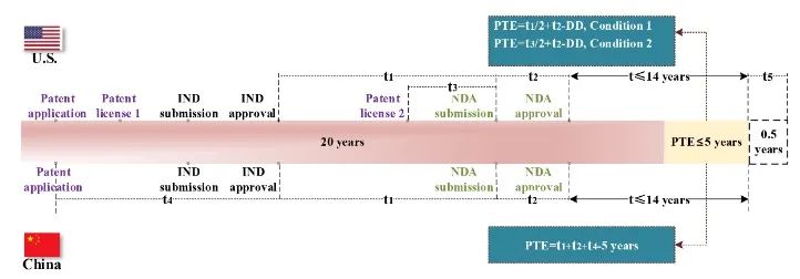 图2.我国和美国PTE计算方法模拟两国创新药的PTE长度比较