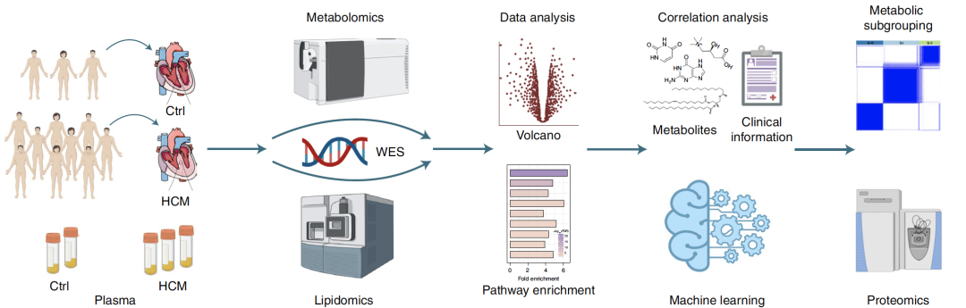 首先,为了解析HCM患者心肌组织及血浆中的代谢特征并探究代谢在HCM中的调节、诊断、预测以及分型作用,研究人员收集了349例HCM患者与16例非HCM对照的心肌组织以及143例HCM患者与60例正常人血浆样本,对其进行代谢组学及脂质组学分析(图1)。