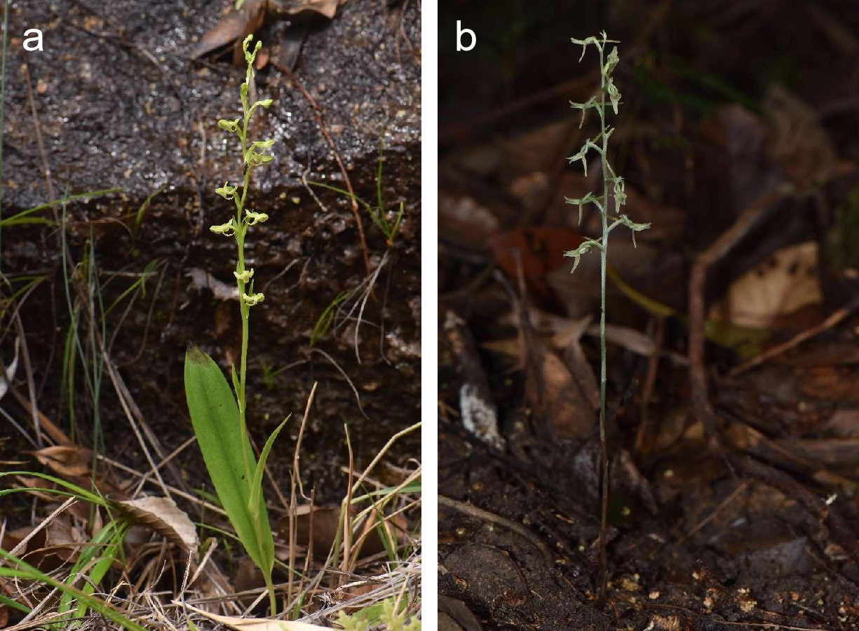 图1.部分真菌异养的紫金舌唇兰(a)和完全真菌异养的广东舌唇兰(b)