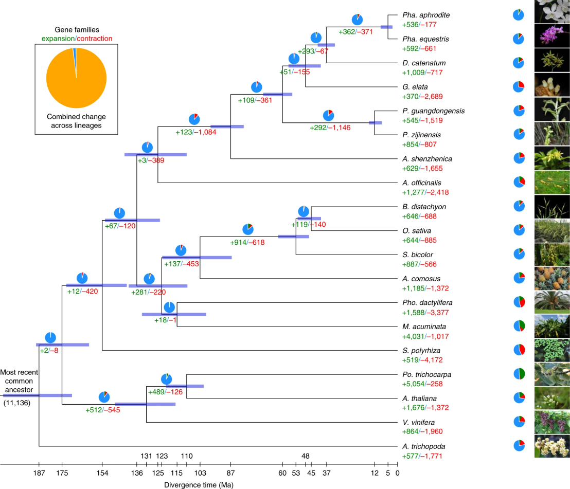 图2. 7个兰科植物和12个其他被子植物的分化与基因家族进化图谱,兰亚科的舌唇兰与树兰亚科在约60Myr前分化,两种舌唇兰间分化时间则为11Myr