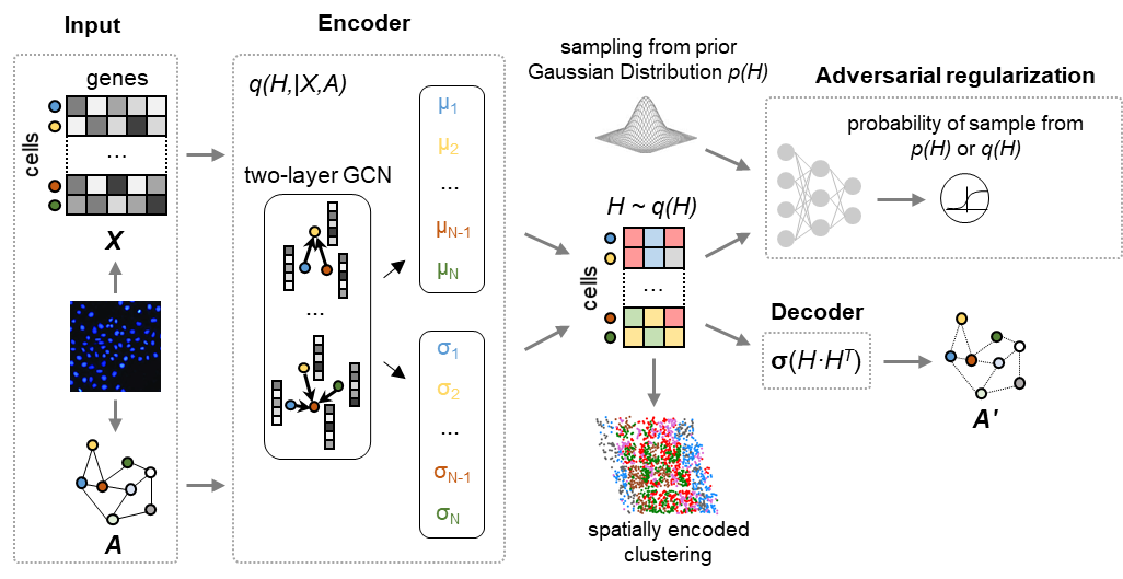针对细胞互作关系的全面重构这一重要需求,杨雪瑞课题组首先提出理论假设:组织中空间上临近的细胞间应该富集了多种模式的互作与信息交流,而细胞内多维度分子特征谱图是细胞互作的驱动与调控因素,同时也反映了细胞组装与互作状态对细胞内生物学过程所产生的影响。因此,可以利用空间临近细胞的多维度信息,学习、挖掘细胞内分子特征与细胞间互作二者之间的内在关联。基于该理论思路,杨雪瑞课题组2018级博士生李润泽尝试了多种分析方法,最终使用新型人工智能策略,基于变分图自动编码器(variational graph autoencoder, VGAE)开发了对单细胞空间转录组数据的深度学习框架方法DeepLinc。