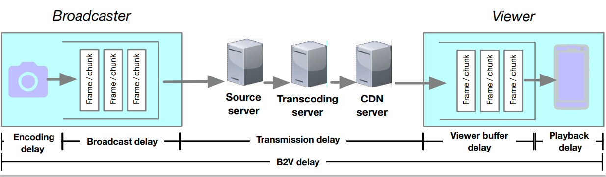图1.众包直播业务中主播到观众业务全链路延时构成