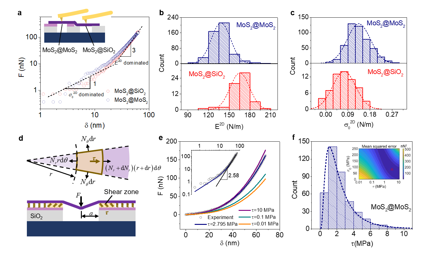 利用AFM探针对上层悬空MoS2施加应力,测试其应变(图2a)。采用固定边界条件下简单的应力-应变关系,可得到了上层MoS2的名义弹性模量。结果发现,上层MoS2的名义弹性模量与层间扭转角度无关,但其数值相比直接转移在SiO2/Si基底上的样品小15%左右(图2c)。这一事实说明,MoS2较弱的层间作用导致上层MoS2弹性模量测试值低于真实值。考虑到弹性模量是材料的本征性质,不应与约束条件或测试方法有依赖关系,本研究提出了剪切边界模型,用以描述上层MoS2在纳米压痕实验中的受力情况。该模型假设:在悬空区域,上层MoS2仅受到探针施加的弹性应力,而在有支撑的区域,上层MoS2受到平行与基底的拉应力和层间剪切应力的作用(图3d)。通过模型分析,本研究建立了全新的剪切边界模型,并获得了载荷-下压位移的近似公式,该公式同时考虑了二维材料的预应力、弹性模量和层间剪切的贡献,比固定边界条件模型更具普适性。将实测数据通过最小二乘法拟合该公式,即可获得MoS2的层间剪切应力。通过对30个不同扭转角度的150余个样品测试分析,研究发现其层间剪切应力与扭转角度之间无明显的依赖关系(图4a)。分子动力学模拟纳米压痕过程也给出相同的结论。这一现象是由于二维材料的层间作用是长程平均后的范德华力,因此克服了扭转晶格结构带来的影响,不具有扭转角度的依赖性。