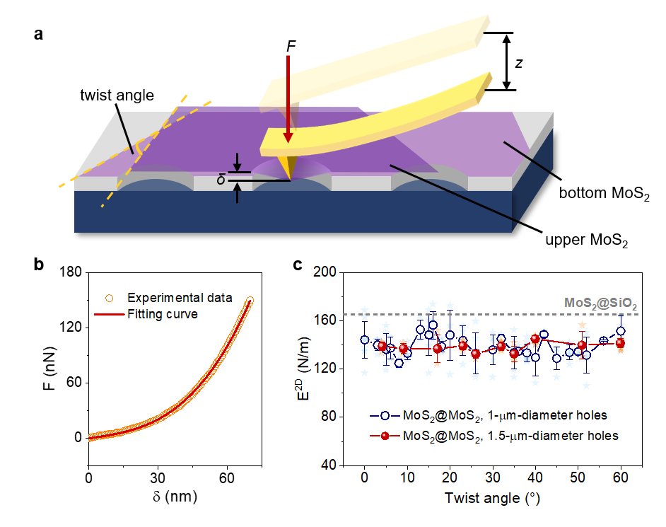 图2. 纳米压痕法测试扭角双层MoS2上层的弹性模量。