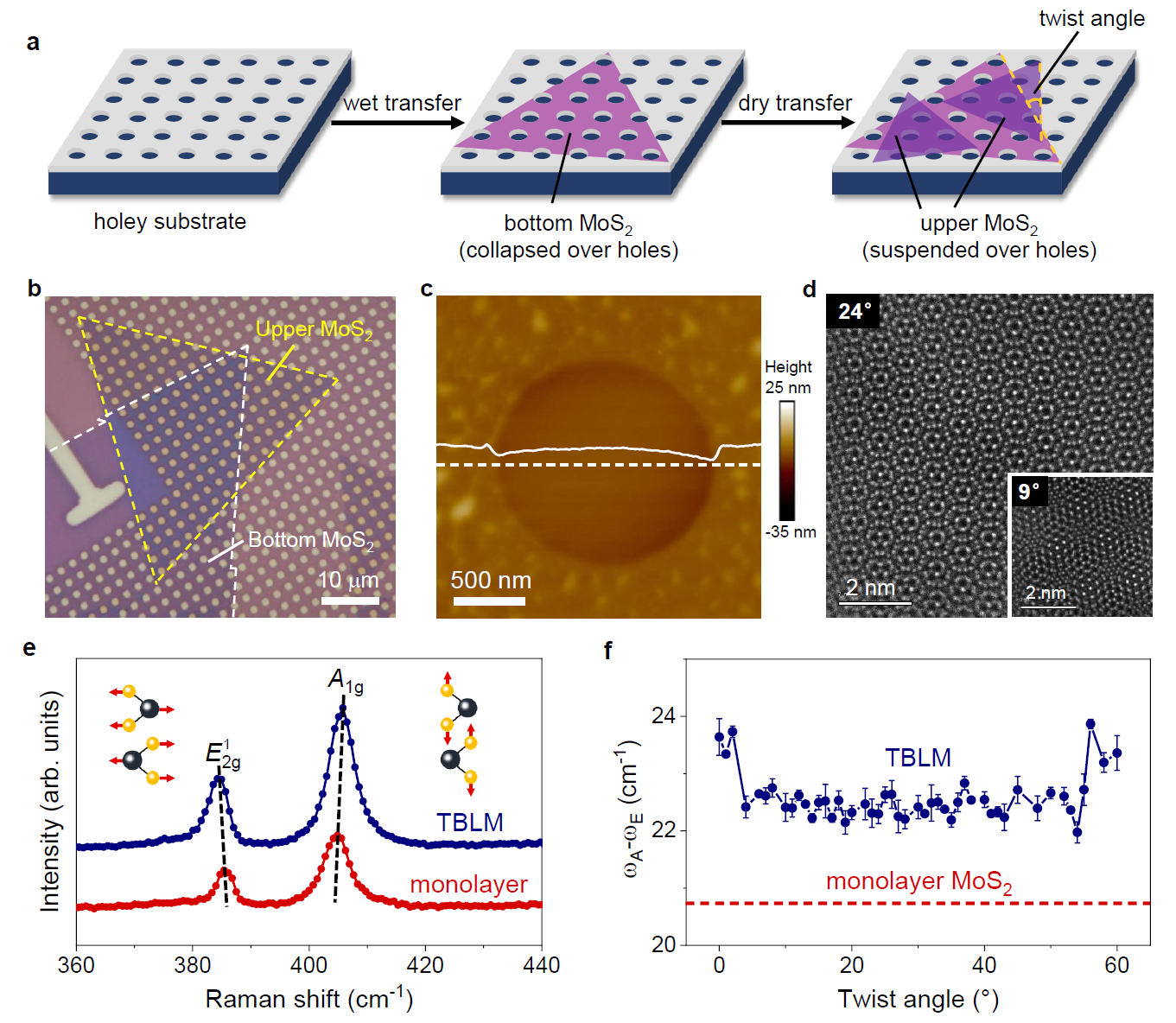 该方法首先将CVD生长的单层MoS2利用PMMA湿法转移到多孔SiO2/Si基底上,并通过溶剂浸泡与蒸发的过程去除悬空部位,只留下与基底贴合的MoS2;随后在该MoS2层上利用PMDM干法随机堆叠上层MoS2,并在这一步避免溶剂浸泡,以保持上层悬空MoS2完好而不破损。由于CVD生长的MoS2单晶呈现正三角形,因此其扭转角度可以简单地用光学显微镜测量(图1b)。在这一实验方法中,上层MoS2受到下层MoS2的约束,在有基底支撑处以范德华力结合。